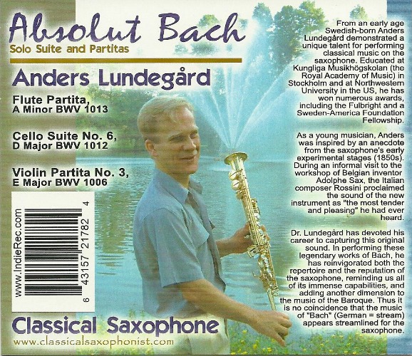 "I have well received and listened to your wonderful CD with Bach music. I really enjoyed it very much. For a lover of saxophone, it is a "tour de force" with always very great musicality. Please accept my best felicitations for this beautiful realization. With my best homage." IN PERFORMING these works on soprano and alto saxophone, I maintain the original key and form, in accordance with the standard editions of Bach's own manuscripts. The only alteration is the octave transposition of the cello suite; the modern cello of today sounds one octave lower then the alto saxophone. However, Bach intended the sixth suite to be performed on a piccolo cello in order to facilitate the playing of the extended upper range, which he utilized composing in this, his final suite for unaccompanied cello. Hence, the range of the alto saxophone more than grants the composer's wish. J.S. BACH (1685-1750) composed all of his unaccompanied music for violin, cello and flute from 1718-1725, seven dramatic years marked by trauma and change - the title page for one of the cello suites reads "lonely but free." The flute partita dates from 1718, while Bach served Prince Leopold as Kapellmeister at Cöthen. In 1720 Bach completed the cycle of violin partitas even as his first wife Marie Barbara (1685-1720) passed away. In November of the same year Bach visited Hamburg, and was offered a post as organist at the Jakobikirche, which he declined. The sixth cello suite was written during an eventful 1725: Bach was working as Thomaskantor in Leipzig, his tenth child, Christian Gottlieb was born, and his forerunner Scarlatti died. All three compositions are based on the traditional baroque dance suite from (i.e. allemande, courante, sarabande, etc.). Bach's use of these dance forms marked an artistic high point of the genre. Had the saxophone been invented 125 years earlier, Bach and his contemporaries would undoubtedly have written for the instrument - while praising its multi-faceted tone color and dynamics